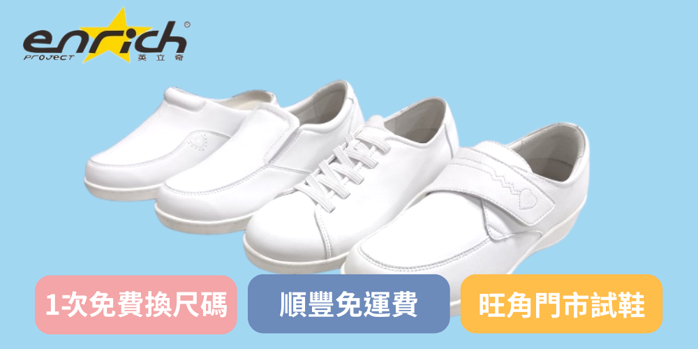 於優惠期間購買的ENRICH 雲柔護士鞋提供一次免費換貨, 如收到鞋子後尺碼不合適, 可將鞋子交回我們旺角門市。